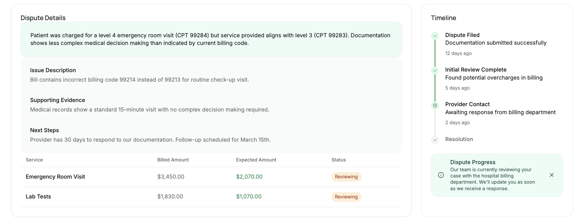 This feature provides a clear and structured overview of a submitted medical bill dispute, helping patients track progress and understand the details behind overcharges. Patients can view a breakdown of billed versus expected amounts for each service, with current status indicators like “Reviewing.” A timeline on the right outlines each step taken, from the initial filing to ongoing provider contact, offering transparency and peace of mind throughout the process. The system confirms that documentation has been submitted, overcharges identified, and that a response from the billing department is pending. A live “Dispute Progress” box reassures users that the team is actively managing the case and will provide timely updates. This streamlined, patient-friendly interface empowers individuals to advocate for fair billing without needing deep expertise in medical coding or insurance disputes.